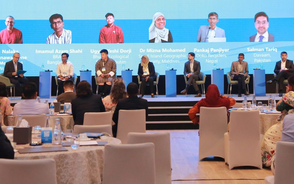 Nalaka Gunawardene (Moderator), Imamul Azam Shahi  (BRAC), Ugyen Yeshi Dorji (Bhutan Ecological Society), Dr. Mizna Mohamed (Small Island Geographic Society), Salman Tariq (Davaam Life), Pankaj Panjiyar (Doko Recyclers) & Buddhika Prabhaswin (Ecocycle Lanka)