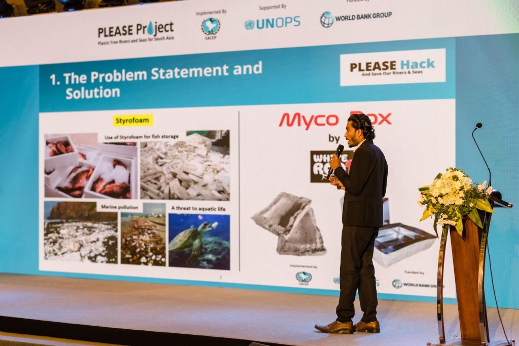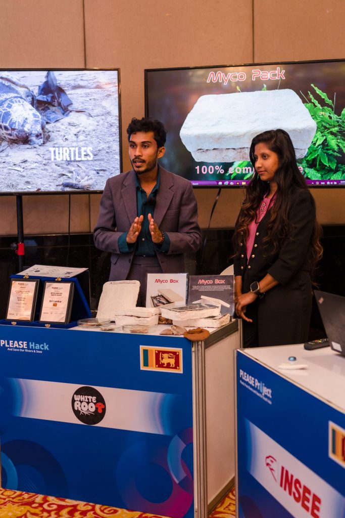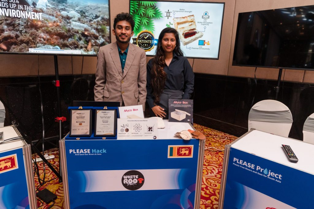In Sri Lanka, fisherfolk commonly use Styrofoam boxes to store fish. These boxes break easily, and when abandoned in the natural environment, they can break down and create microplastics harmful to marine life. As a solution to this pervasive issue, Team White Root, who was crowned the Regional and National Winners of the PLEASE Youth Hackathon, introduced their innovation – ‘Myco Box’. Myco Box offers a fully biodegradable fish storage container with a mycelium outer layer, a root-like structure found in fungus, while the inner layer combines aluminum foil and cardboard for durability and reuse. This innovative product offers a sustainable alternative to traditional Styrofoam packaging, aligning with principles of environmental sustainability and the circular economy.